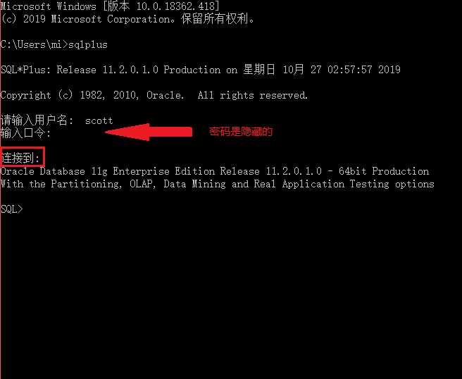 在控制台输入“sqlplus”然后回车,一般我们用SCOTT用户来登录