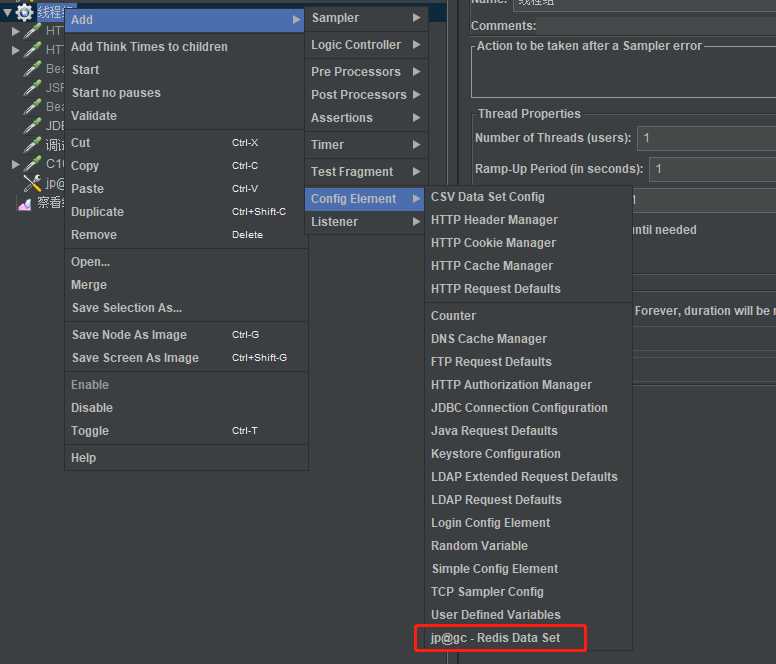 2、右键添加配置元件 jp@gc - Redis Data Set