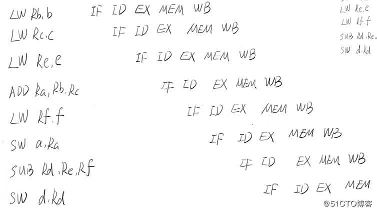 如图所示,ADD操作时有一个空闲(X)操作,因为当想让B和C相加的时候,在图中ADD的X操作时,C还没从内存中读取(当MEM操作完成时,C才从内存中读取。这里会有一个疑问,此时还没有回写(WB)到R2中,怎么会将R1与R1相加。那是因为在硬件电路当中,会使用一种叫“旁路”的技术直接把数据从硬件当中读取出来,所以不需要等待WB执行完才进行ADD)。所以ADD操作中会有一个空闲(X)时间。在SW操作中,因为EX指令不能和ADD的EX指令同时进行,所以也会有一个空闲(X)时间。