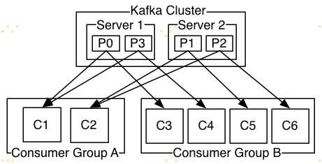 两台服务器组成的Kafka集群持有四个分区(P0-P3),两个消费者组。消费者组A有两个消费者实例,而消费者B有四个消费者实例。