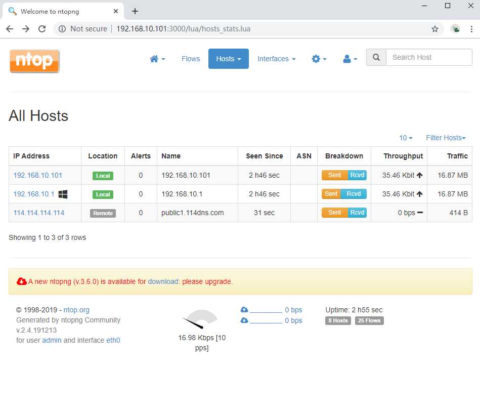 来自维基百科的知识“ntop是一个网络探测器,它以与top显示进程般类似的方式显示网络使用率。在交互模式中,它显示了用户终端上的网络状态。在网页模式中,它作为网络服务器,创建网络状态的HTML转储文件。它支持NetFlow/sFlowemitter/collector,这是一个基于HTTP的客户端界面,用于创建ntop为中心的监控应用,并使用RRD来持续存储通信数据”。