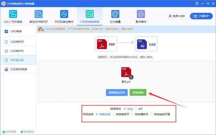 接着在转换页面中设置文件格式转换的“转换格式”和“页码选择”。然后点击页面中的“开始转换”就可以了。
