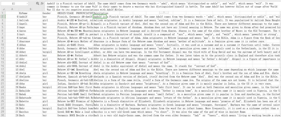 获取A-Z每个名字的姓名(Ename)、ORIGIN/USAGE、SOURCE、MEANING,More info about the name等,并存入csv中。