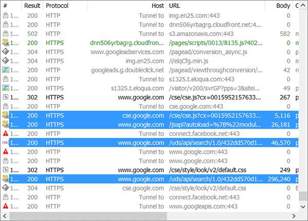 问号(?)后边跟一个字符串,Fiddler 将所有会话中存在该字符串匹配的全部高亮显示(下图输入的是 ?google.com)