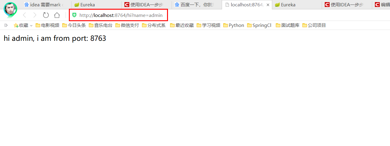 打开浏览器,在一个新的窗口中输入地址:http://localhost:8764/hi?name=admin,如果成功则返回如下信息则表示成功调用了服务提供者的服务接口(根据端口可以知道,8763端口是服务提供者端口)