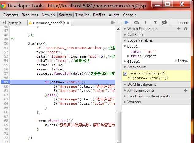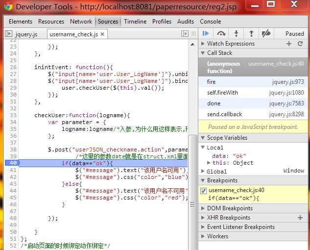 这里要注意的是返回值data的格式,在chrome设置Javascript断点观察到的返回值明显不同