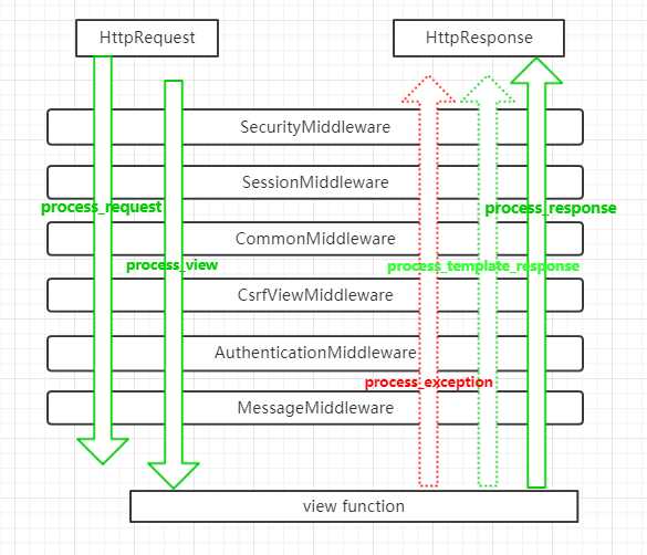 请求到达中间件之后,先按照正序执行每个注册中间件的process_reques方法,process_request方法返回的值是None,就依次执行,如果返回的值是HttpResponse对象,不再执行后面的process_request方法,而是执行当前对应中间件的process_response方法,将HttpResponse对象返回给浏览器。也就是说:如果MIDDLEWARE中注册了6个中间件,执行过程中,第3个中间件返回了一个HttpResponse对象,那么第4,5,6中间件的process_request和process_response方法都不执行,顺序执行3,2,1中间件的process_response方法。