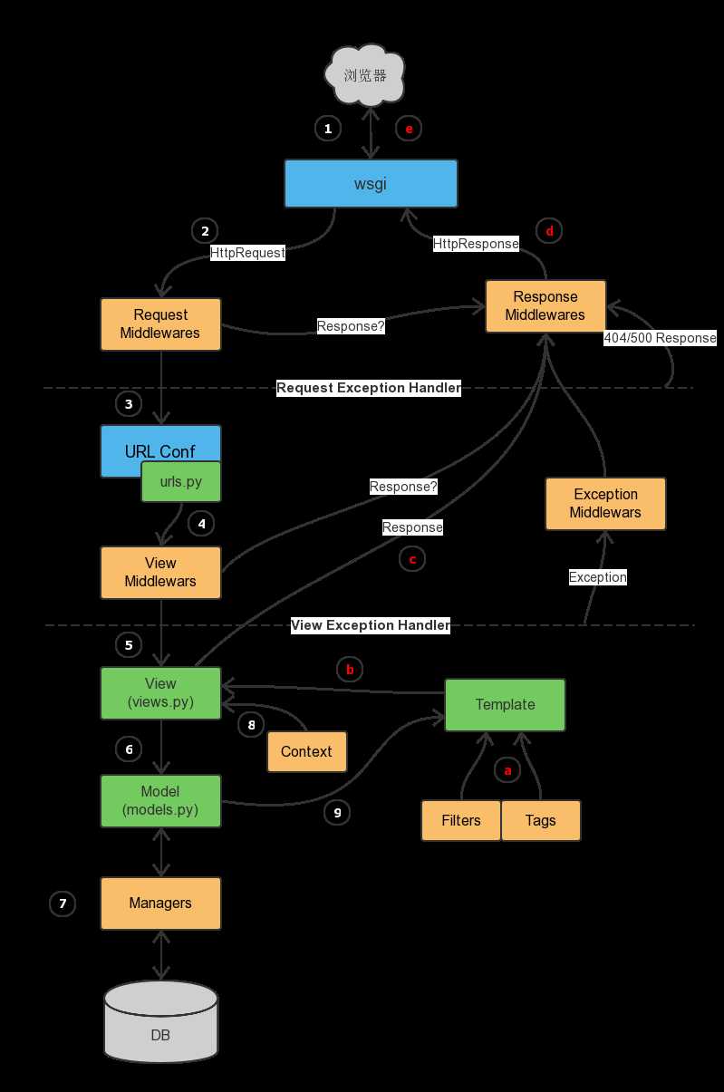 process_template_response和process_exception两个方法的触发是有条件的,执行顺序也是倒序。总结所有的执行流程如下: