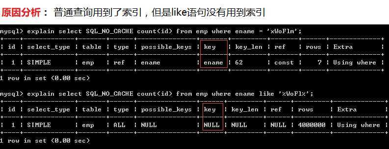 2,对于使用like的查询,查询如果是 ‘%aaa‘ 不会使用到索引, ‘aaa%‘ 会使用到索引。