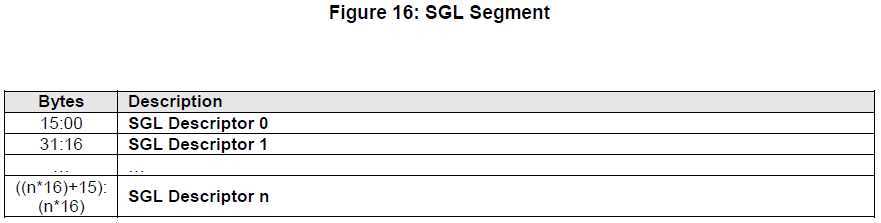 A Scatter Gather List (SGL) is a data structure in memory address space used to describe a data buffer. The controller indicates the SGL types that it supports in the Identify Controller data structure. A data buffer is either a source buffer or a destination buffer. An SGL contains one or more SGL segments. The total length of the Data Block and Bit Bucket descriptors in an SGL shall be equal to or exceed the amount of data required by the number of logical blocks transferred.