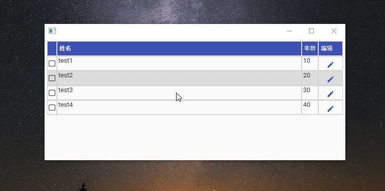 <Window x:Class="WpfMaterial.Core.Views.ListView" xmlns="http://schemas.microsoft.com/winfx/2006/xaml/presentation" xmlns:x="http://schemas.microsoft.com/winfx/2006/xaml" xmlns:materialDesign="http://materialdesigninxaml.net/winfx/xaml/themes" xmlns:prism="http://prismlibrary.com/" xmlns:vm="clr-namespace:WpfMaterial.Core.ViewModels" Background="{DynamicResource MaterialDesignPaper}" FontFamily="{DynamicResource MaterialDesignFont}" FontSize="16"> <Window.DataContext> <vm:ListViewViewModel /> </Window.DataContext> <Window.Resources> <Style x:Key="CrudIsSelectedCheckBoxStyle" BasedOn="{StaticResource {x:Type CheckBox}}" TargetType="{x:Type CheckBox}"> <Setter Property="HorizontalAlignment" Value="Center" /> <Setter Property="VerticalAlignment" Value="Center" /> </Style> <Style x:Key="CrudDataGridColumnHeaderStyle" BasedOn="{StaticResource {x:Type DataGridColumnHeader}}" TargetType="{x:Type DataGridColumnHeader}"> <Setter Property="Background" Value="{DynamicResource PrimaryHueMidBrush}" /> <Setter Property="BorderBrush" Value="LightGray" /> <Setter Property="BorderThickness" Value="1" /> <Setter Property="IsEnabled" Value="False" /> <Setter Property="Padding" Value="2" /> <Setter Property="Height" Value="30" /> <Setter Property="Foreground" Value="{DynamicResource PrimaryHueMidForegroundBrush}" /> </Style> <Style x:Key="CrudDataGridRowHeaderStyle" BasedOn="{StaticResource {x:Type DataGridRowHeader}}" TargetType="{x:Type DataGridRowHeader}"> <Setter Property="BorderThickness" Value="0" /> <Setter Property="Width" Value="0" /> </Style> <Style x:Key="CrudDataGridRowStyle" BasedOn="{StaticResource {x:Type DataGridRow}}" TargetType="{x:Type DataGridRow}"> <Setter Property="VerticalContentAlignment" Value="Stretch" /> <Setter Property="Height" Value="30" /> <Style.Triggers> <Trigger Property="IsSelected" Value="True"> <Setter Property="Background" Value="{DynamicResource PrimaryHueLightBrush}" /> <Setter Property="Foreground" Value="{DynamicResource PrimaryHueLightForegroundBrush}" /> </Trigger> </Style.Triggers> </Style> <Style x:Key="CrudDataGridCellStyle" BasedOn="{StaticResource {x:Type DataGridCell}}" TargetType="{x:Type DataGridCell}"> <Setter Property="Foreground" Value="{DynamicResource PrimaryHueLightForegroundBrush}" /> <Setter Property="BorderBrush" Value="LightGray" /> <Setter Property="BorderThickness" Value="1" /> <Setter Property="Padding" Value="0" /> <Style.Triggers> <Trigger Property="IsSelected" Value="True"> <Setter Property="Background" Value="{DynamicResource PrimaryHueLightBrush}" /> <Setter Property="Foreground" Value="{DynamicResource PrimaryHueLightForegroundBrush}" /> <Setter Property="BorderBrush" Value="LightGray" /> </Trigger> </Style.Triggers> </Style> <Style x:Key="CrudEditButtonStyle" BasedOn="{StaticResource MaterialDesignFlatButton}" TargetType="{x:Type Button}"> <Setter Property="HorizontalAlignment" Value="Center" /> <Setter Property="Cursor" Value="Hand" /> <Setter Property="ToolTip" Value="编辑" /> <Setter Property="Content" Value="编辑" /> </Style> </Window.Resources> <Grid> <DataGrid Margin="5" AutoGenerateColumns="False" CanUserAddRows="False" CanUserDeleteRows="False" CanUserResizeColumns="False" CanUserResizeRows="False" CellStyle="{StaticResource CrudDataGridCellStyle}" ColumnHeaderStyle="{StaticResource CrudDataGridColumnHeaderStyle}" ItemsSource="{Binding Items}" RowHeaderStyle="{StaticResource CrudDataGridRowHeaderStyle}" RowStyle="{StaticResource CrudDataGridRowStyle}" SelectionMode="Single" SelectionUnit="FullRow"> <DataGrid.Columns> <DataGridTemplateColumn> <DataGridTemplateColumn.CellTemplate> <DataTemplate> <CheckBox IsChecked="{Binding Selected, Mode=TwoWay}" Style="{StaticResource CrudIsSelectedCheckBoxStyle}" /> </DataTemplate> </DataGridTemplateColumn.CellTemplate> </DataGridTemplateColumn> <DataGridTextColumn Width="*" Binding="{Binding Name}" Header="姓名" /> <DataGridTextColumn Width="Auto" Binding="{Binding Age}" Header="年龄" /> <DataGridTemplateColumn Width="Auto" Header="编辑"> <DataGridTemplateColumn.CellTemplate> <DataTemplate> <Button Style="{StaticResource CrudEditButtonStyle}"> <materialDesign:PackIcon Kind="Edit" /> </Button> </DataTemplate> </DataGridTemplateColumn.CellTemplate> </DataGridTemplateColumn> </DataGrid.Columns> </DataGrid> </Grid> </Window>