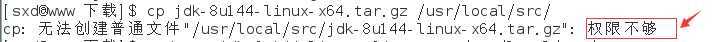 cp拷贝文件的时候,出现了权限不够的问题,也就解释了为什么刚刚上面查看JDK压缩文件的时候,文件名是红色的。