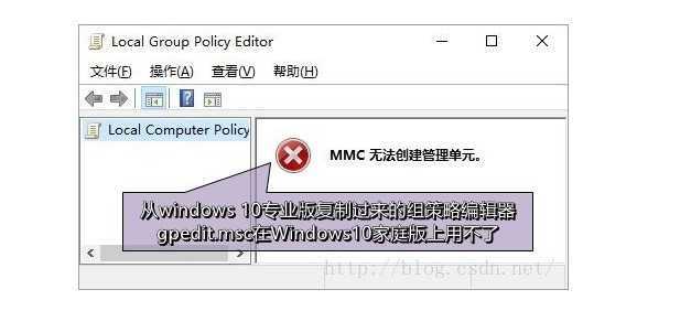 由于Windows系统默认是禁止Guest账户从网络登录的,我们需要解除这个限制。首先想到的是用组策略编辑器gpedit.msc。 但是Windows 10家庭版没有组策略编辑器,我们先尝试用U盘把Windows 10专业版的组策略编辑器文件复制过来运行,结果在Windows10家庭版上用不了。