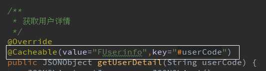 @Autowired private RedisUtil redisUtil; /** * 获取用户详情--使用RedisUtil工具手动缓存 */ @Override public JSONObject getUserDetail(String userCode) { JSONObject retJson = new JSONObject(); String retCode = "1"; String retMsg = "操作失败!"; JSONObject bizDataJson = new JSONObject(); try { FUserinfo fUserinfo = new FUserinfo(); fUserinfo.setUserCode(userCode); fUserinfo.setIsValid("T"); fUserinfo = fUserinfoDao.queryDetail(fUserinfo); String key = "FUserinfo::"+userCode; redisUtil.set(key, fUserinfo,-1); //向Redis中缓存数据,-1为设置永久时效 bizDataJson = JSONObject.parseObject(JSON.toJSONString(fUserinfo)); retCode = "0"; retMsg = "操作成功!"; } catch (Exception e) { log.error(e); } retJson.put("retCode", retCode); retJson.put("retMsg", retMsg); retJson.put("bizData", bizDataJson); return retJson; }