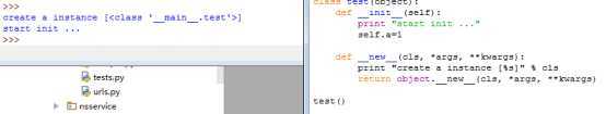 在object类中存在一个静态的__new__(cls, *args, **kwargs)方法,该方法需要传递一个参数cls,cls表示需要实例化的类,此参数在实例化时由Python解释器自动提供,__new__方法必须有返回值,且返回的是被实例化的实例,只有在该实例返回后才会调用__init__来进行初始化,初始化所用的实例就是__new__返回的结果,也就可以认为是self,我们来看下面的例子: