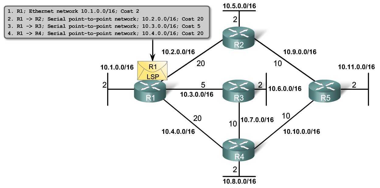 每台路由器创建一个链路状态数据包 (LSP),其中包含与该路由器直连的每条链路的状态。这通过记录每个邻居的所有相关信息(包括邻居 ID、链路类型和带宽)来完成。
