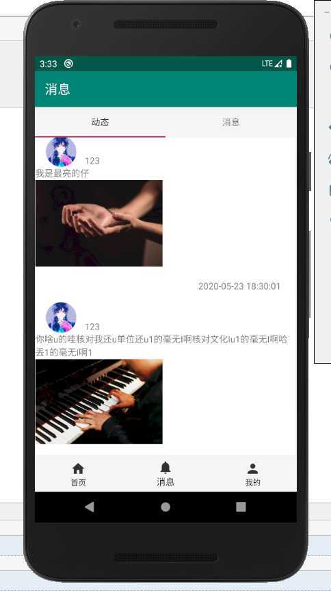 今日完成动态的展示,遇到的困难有:图片的动态展示问题,采用的解决办法是在item布局中加入linerlayout水平布局,然后在布局中自动生成imgview来展示多个图片