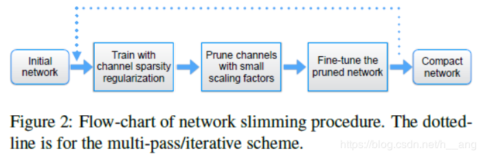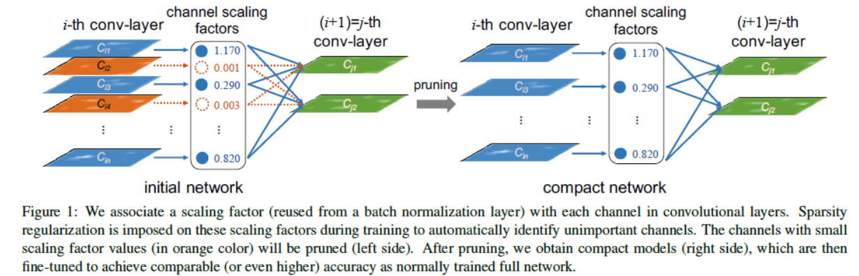 剪掉一个通道的本质是要剪掉所有与这个通道相关的输入和输出连接关系,我们可以直接获得一个窄的网络(Figure 1),而不需要借用任何特殊的稀疏计算包。缩放因子扮演的是通道选择的角色,因为我们缩放因子的正则项和权重损失函数联合优化,网络自动鉴别不重要的通道,然后移除掉,几乎不影响网络的泛化性能。