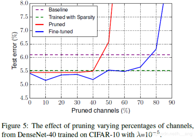 剪枝百分比的影响:$t$设置的过小,节省的资源会很有限,设置的过大,剪掉太多的通道会给准确率带来永久性损伤,无法通过后续的微调恢复;我们在CIFAR-10上训练了一个DenseNet-40模型,$\gamma=10{{-5}}$,Figure 5展示了结果: