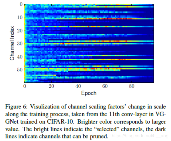 通道稀疏正则化的影响:Figure 4展示的时不同的γ\gammaγ取值下,缩放因子值的分布情况。可以看到$\gamma=10{{-4}}$时,几乎所有的缩放因子值都掉到了一个接近零的区域,这个过程中可以看成是一种类似于网络中间层的选择过程,只有不可忽视的缩放因子对应的通道才会被选择。我们进一步通过热力图对这个过程可视化,Figure 6展示的是VGGNet的某一层缩放因子的幅值随迭代次数的变化情况,每个通道开始的初始权重相同,缩放因子值也相同,随着训练的进行,一些通道的缩放因子会逐渐变大(变亮),一些变小(变暗)。