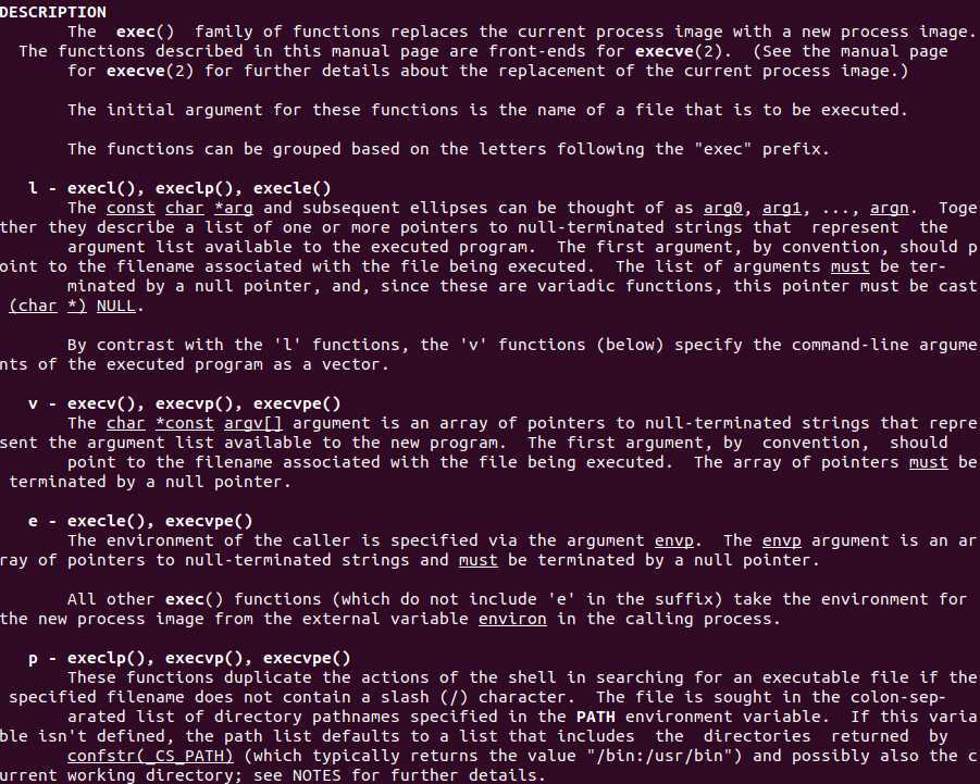 不存在单一的exec函数,而是基于单个系统调用,由一系列的exec函数构成。打开execv族系统调用的man手册如下所示: