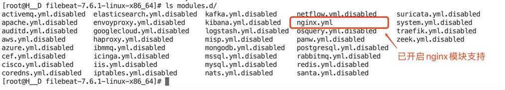 3、查看modules.d目录中的文件,可以看到nginx.yml配置文件,证明nginx module模块已开启