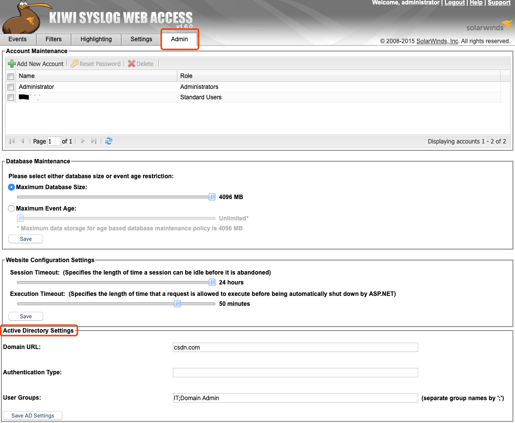 2.Kiwi web server AD认证设置:Solarwinds | Active Directory Authentication setting for Kiwi Syslog Server Web Access