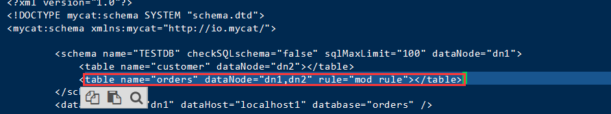 #为orders 表设置数据节点dn1,dn2,并指定分片规则mod_rule(自定义的名字) <table name="orders" dataNode="dn1,dn2" rule="mod_rule"></table>