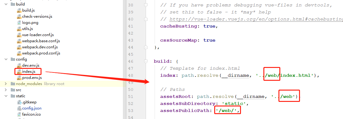 2、打开config/index.js,修改下列参数,本人根目录设为web,所以下面红框内的内容都改为web了