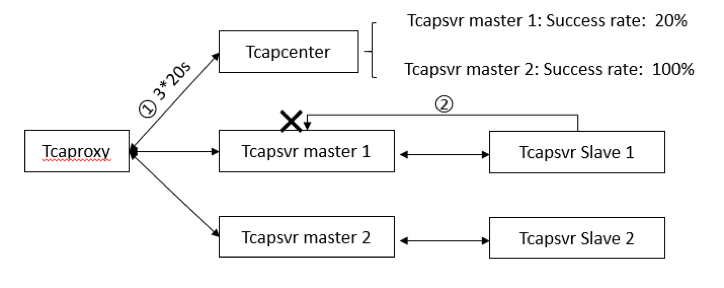 - 存储层异常:tcapsvr Slave发生异常时会被一个新的Slave节点替换。如果tcapsvr master发生异常, Slave会切换成Master,切换过程中的用户请求失败,建议开发者增加重试逻辑代码。Master/Slave支持亚健康切换,读写错误率达到阈值时(默认80%)即进行主从切换,如下图: