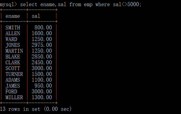 例1:查询薪水不等于5000的员工