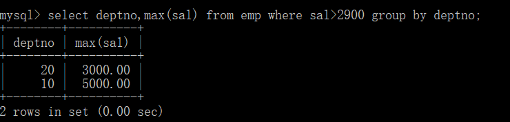 select deptno,max(sal) from emp where sal>2900 group by deptno;