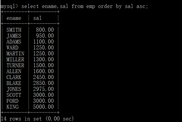 select ename,sal from emp order by sal asc;