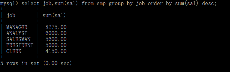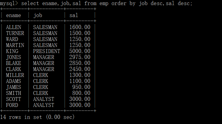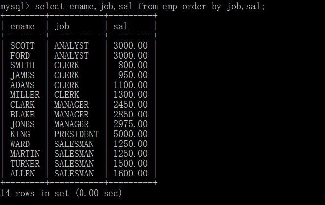 例:按照多个字段排序,如:首先按照job排序,再按照sal排序