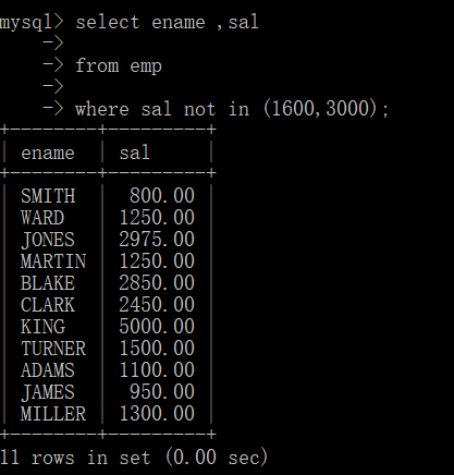 例1:查询出薪水不包含1600和薪水不包含3000的员工