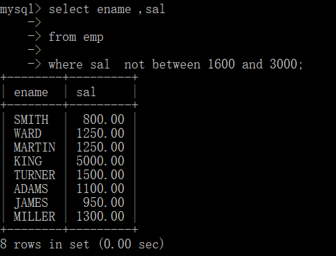 例2:查询出薪水不在1600和3000区间的员工