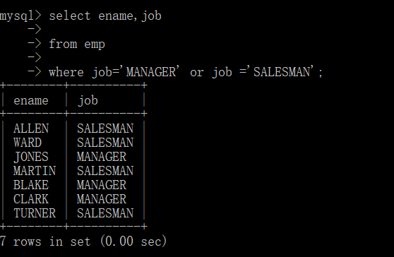 where job=‘MANAGER‘ or job =‘SALESMAN‘;