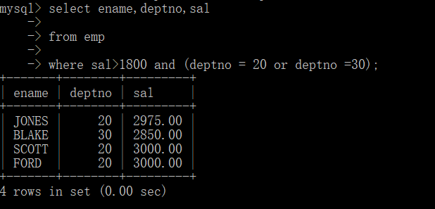 注意:and的优先级要大于or,所以,如果不加括号,其查询结果为薪资大于1800的20部门员工,或者30部门员工的信息,和所要求的的有出入。