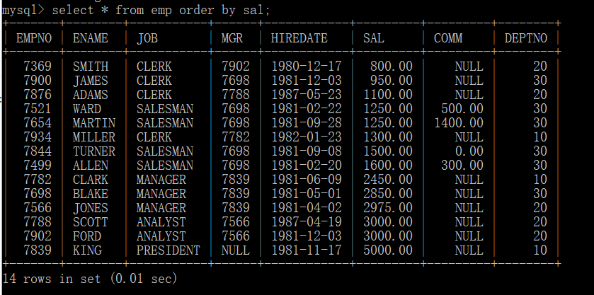 select * from emp order by sal;