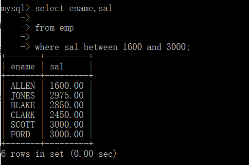 ? select ename,sal from emp where sal between 1600 and 3000;