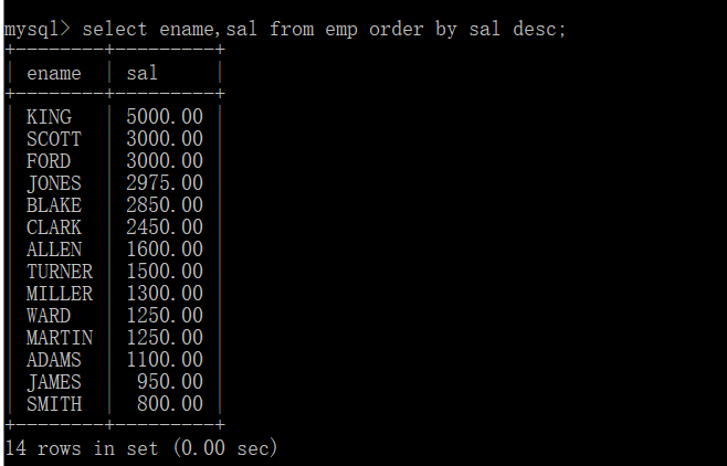 select ename,sal from emp order by sal desc;