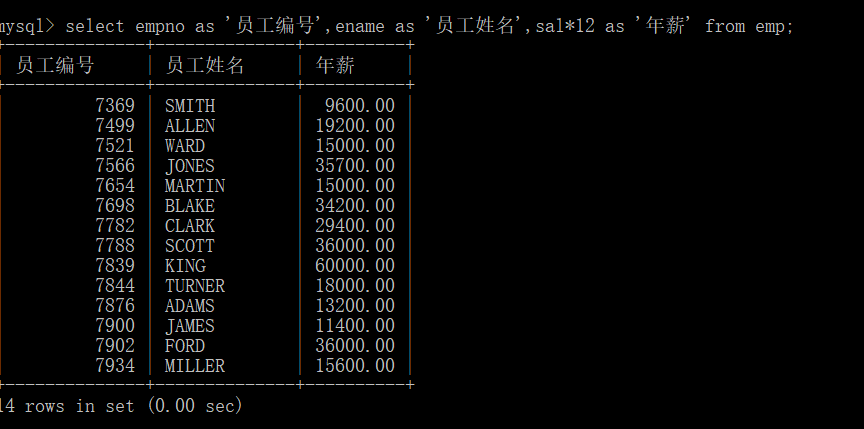 例:列出员工的编号,姓名和年薪,将查询出来的字段显示为中文