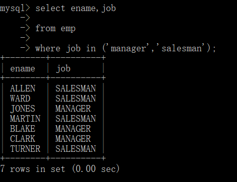 where job in (‘manager‘,‘salesman‘);