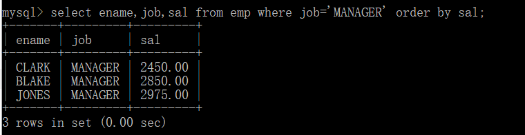 select ename,job,sal from emp where job=‘MANAGER‘ order by sal;