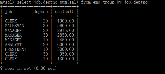 select job,deptno,sum(sal) from emp group by job,deptno;