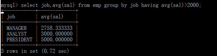select job,avg(sal) from emp group by job having avg(sal)>2000;