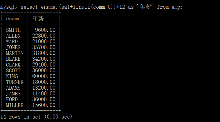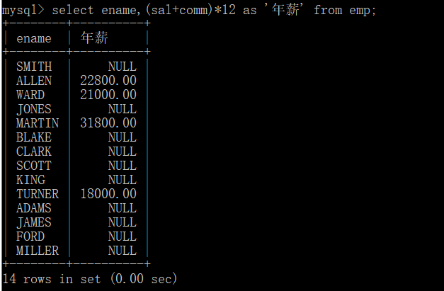 即:select ename,(sal+ifnull(comm,0))*12 as ‘年薪‘ from emp;