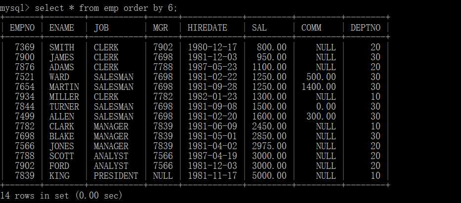 select * from emp order by 6;