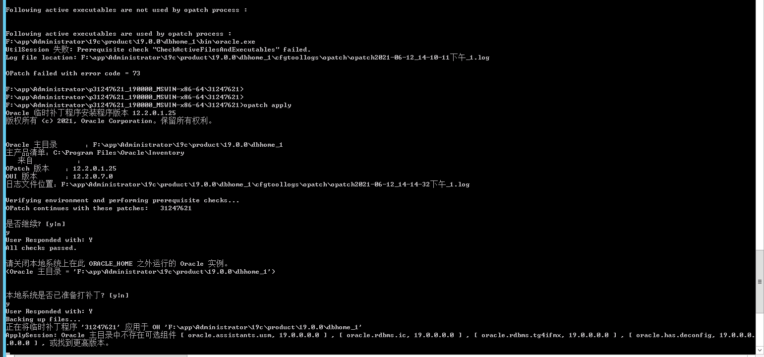 进入补丁解压目录:F:\app\Administrator\p31247621_190000_MSWIN-x86-64\31247621