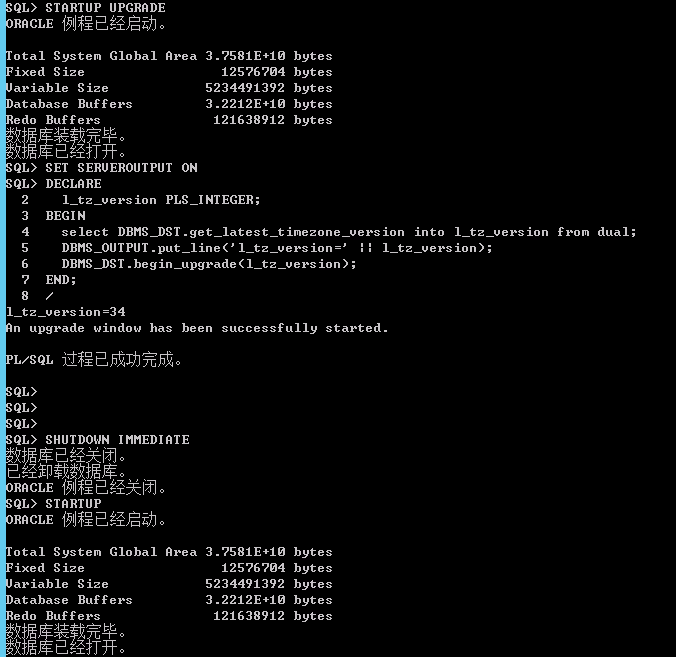 --顺序执行执行以下语句: --以下是受影响的时区的表 TRUNCATE TABLE sys.dst$affected_tables; TRUNCATE TABLE sys.dst$error_table; EXEC DBMS_DST.find_affected_tables; select * from sys.dst$affected_tables; select * from sys.dst$error_table; EXEC DBMS_DST.end_prepare; --升级时区,以upgrade模式启动 SHUTDOWN IMMEDIATE STARTUP UPGRADE SET SERVEROUTPUT ON DECLARE l_tz_version PLS_INTEGER; BEGIN select DBMS_DST.get_latest_timezone_version into l_tz_version from dual; DBMS_OUTPUT.put_line(‘l_tz_version=‘ || l_tz_version); DBMS_DST.begin_upgrade(l_tz_version); END; / SHUTDOWN IMMEDIATE STARTUP --升级 ZONE 文件:会影响所有具有TIMESTAMP WITH TIME ZONE数据类型的表 SET SERVEROUTPUT ON DECLARE l_failures PLS_INTEGER; BEGIN DBMS_DST.upgrade_database(l_failures); DBMS_OUTPUT.put_line(‘DBMS_DST.upgrade_database : l_failures=‘ || l_failures); DBMS_DST.end_upgrade(l_failures); DBMS_OUTPUT.put_line(‘DBMS_DST.end_upgrade : l_failures=‘ || l_failures); END; / SELECT * FROM v$timezone_file;